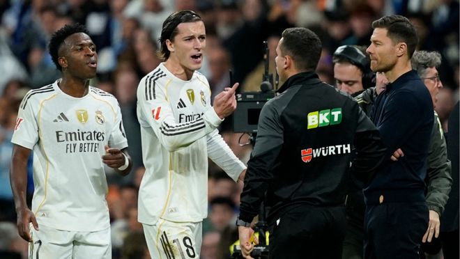 然而,真正的紧张情绪出现在更衣室内。据接近球队的消息人士透露,球员明显分为两派:一派将责任归咎于裁判对红牌的判罚,另一派则直指球队自身缺乏竞争力。这种分歧也影响到了球员与主帅之间的关系。据《DefensaCentral》报道,像维尼修斯、贝林厄姆、巴尔韦德、恩德里克和罗德里戈这样的球员,在阿隆索的执教下感到并不舒适,他们对换帅持开放态度。